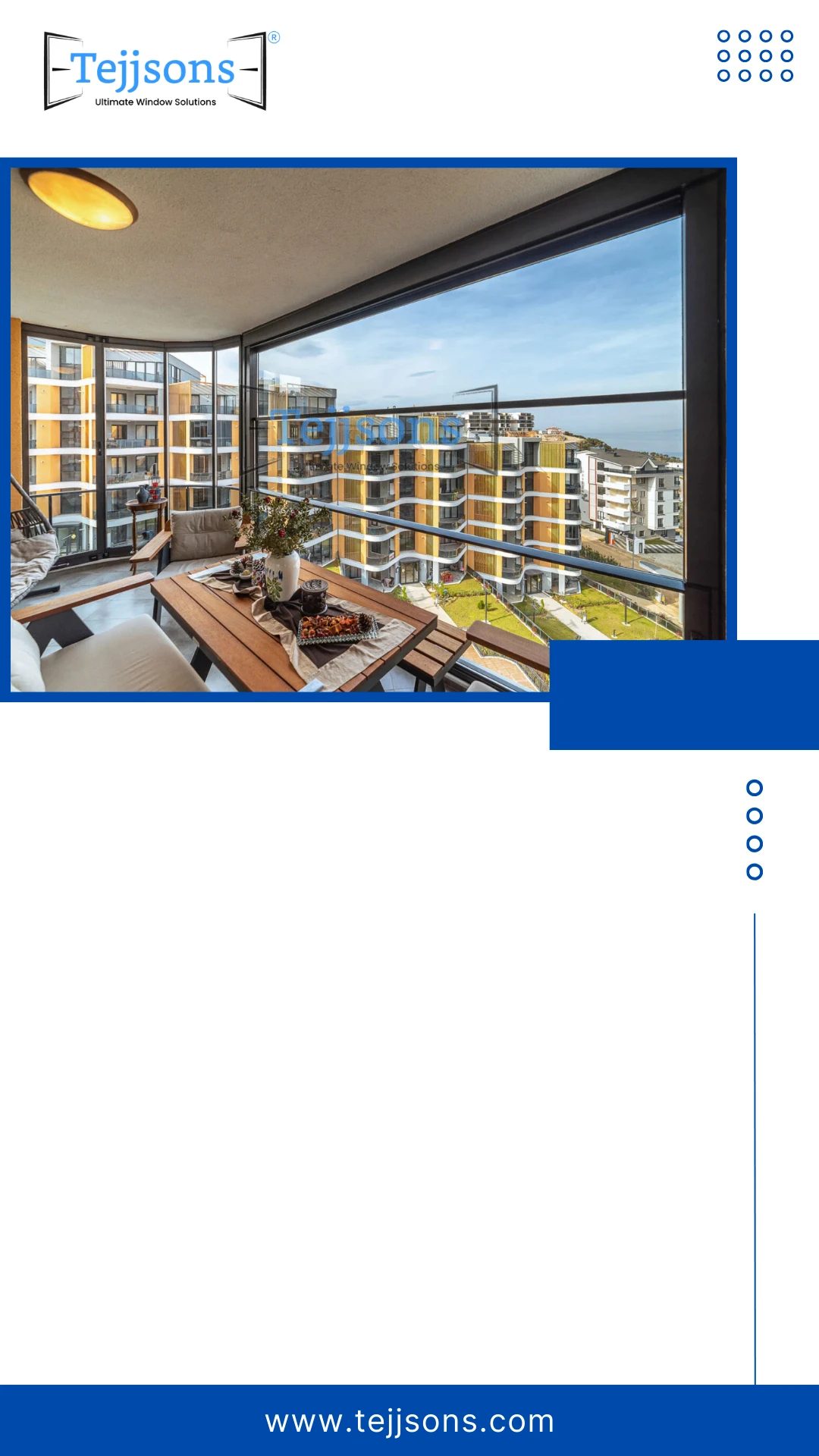 Every design in this list adds light, comfort, and clarity to your space. Tejjsons builds aluminium balcony doors that feel refined and perform under pressure. Get Quote Today!